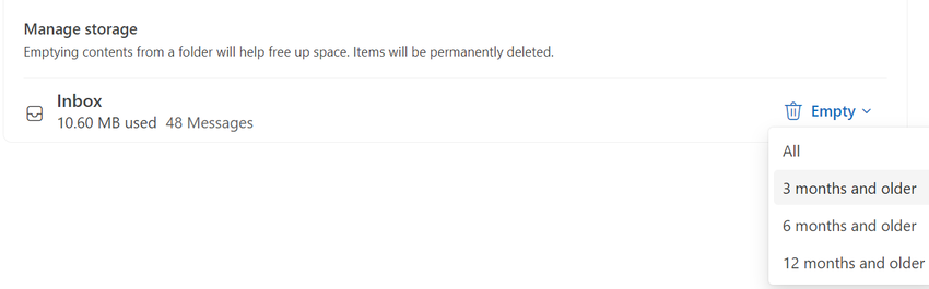 - Determine if your emails have been sorted into separate folders. You might notice that you have many folders in this section, depending on if you need to retain these messages, you can select a incremental option for clearing these emails out, the drop down is pictured below.