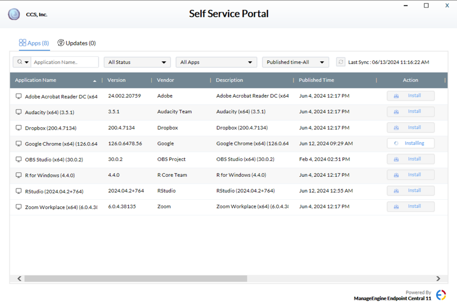4. To install a program, you simply need to click the "install" button on the right. Once a program is installed from this portal, you are able to update it without having admin rights.