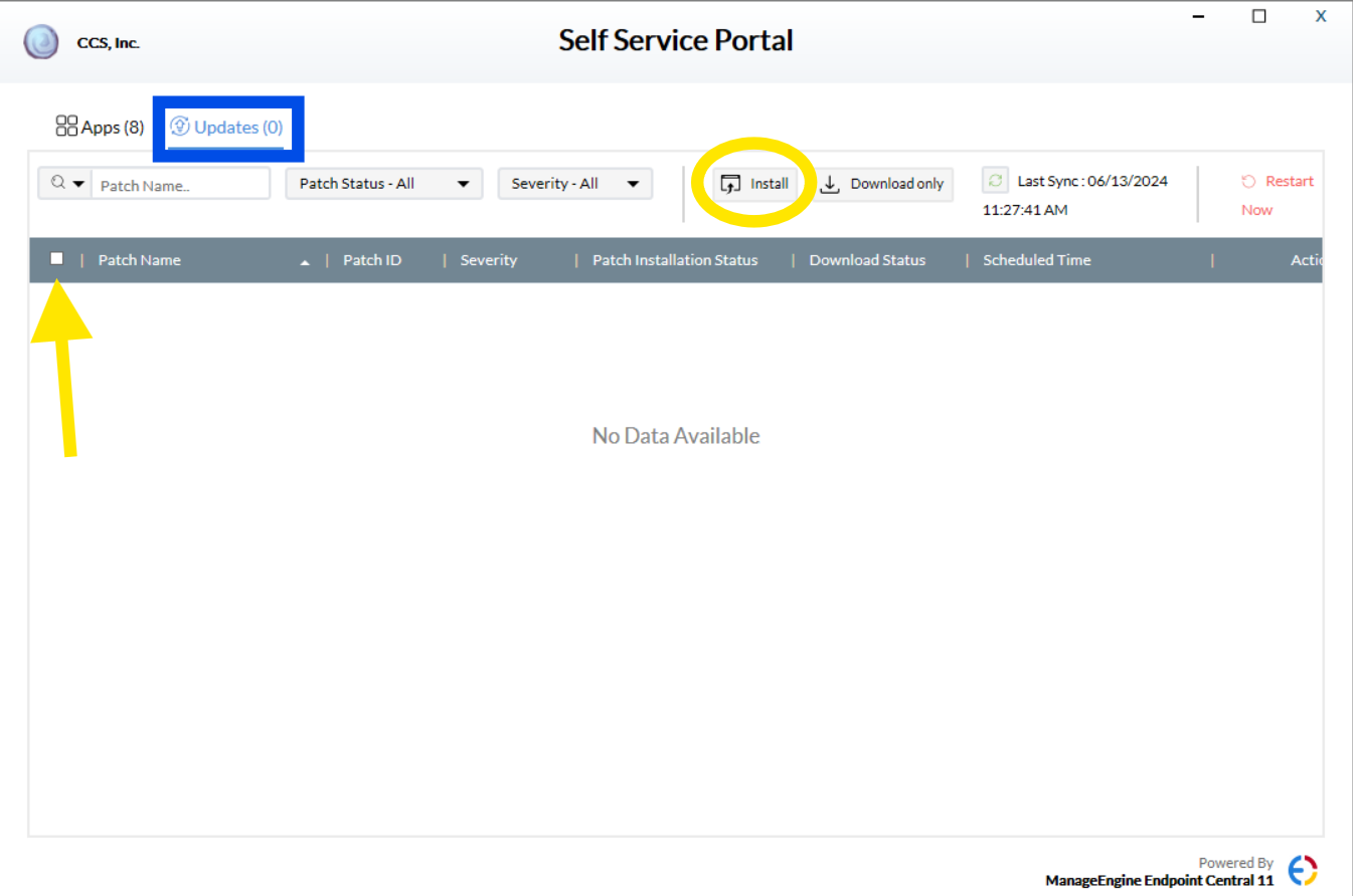 If you want to install updates, simply select the update by checking the box on the left of it, or you can select all available updates by clicking what the yellow arrow is pointing to. Once you have selected the updates you want to install, click the "install" button in the yellow circle.